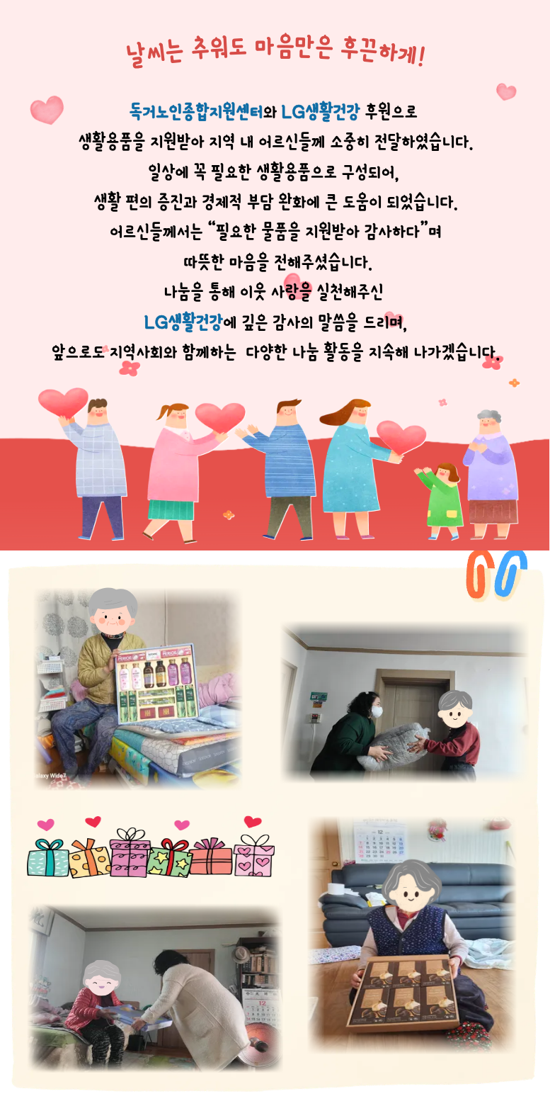 노인맞춤돌봄 [희망열기 캠페인] 2025년 혹한기 대비 취약노인 식생활용품 지원사업 페이지 정보 작성자 관리자 댓글 0건 조회 24회 작성일 25-12-31 16:23 목록 본문 다음글2025년 동지 행사 25.12.29 댓글 0 댓글목록 등록된 댓글이 없습니다.