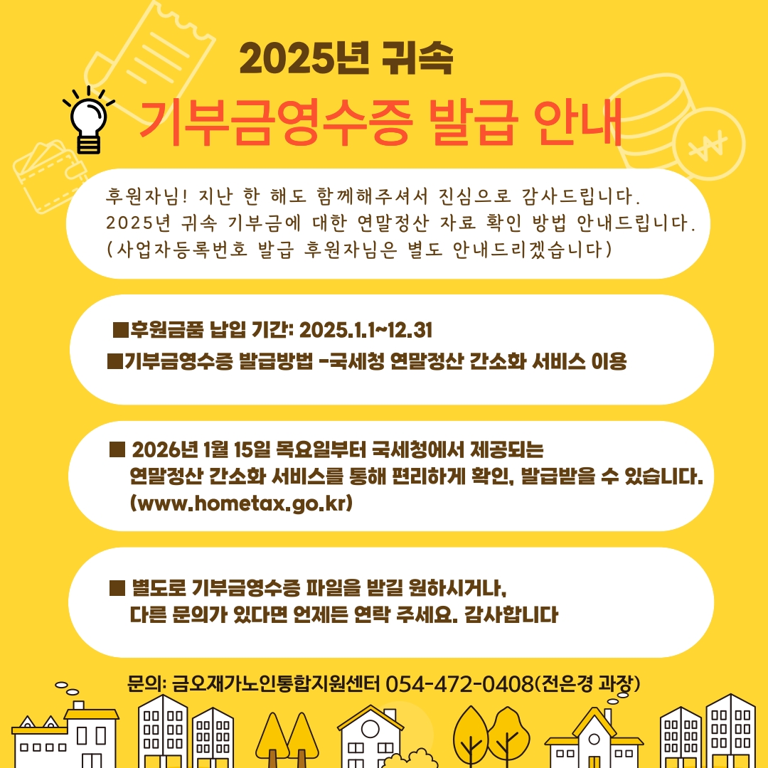 2025년 귀속 기부금영수증 발급 안내 페이지 정보 작성자 관리자 댓글 0건 조회 29회 작성일 26-01-16 17:19 목록 본문 . 다음글2026년 노인맞춤돌봄서비스 생활지원사 채용 공고 26.01.09 댓글 0 댓글목록 등록된 댓글이 없습니다.