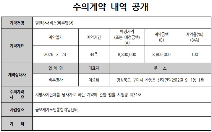 밑반찬지원서비스 수의계약 내역 공개 페이지 정보 작성자 관리자 댓글 0건 조회 84회 작성일 26-02-25 08:59 목록 본문 밑반찬지원서비스 수의계약 내역 이전글노인맞춤돌봄서비스 밑반찬 지원사업 수의계약 내역 공개 26.03.06 다음글2025년 귀속 기부금영수증 발급 안내 26.01.16 댓글 0 댓글목록 등록된 댓글이 없습니다.