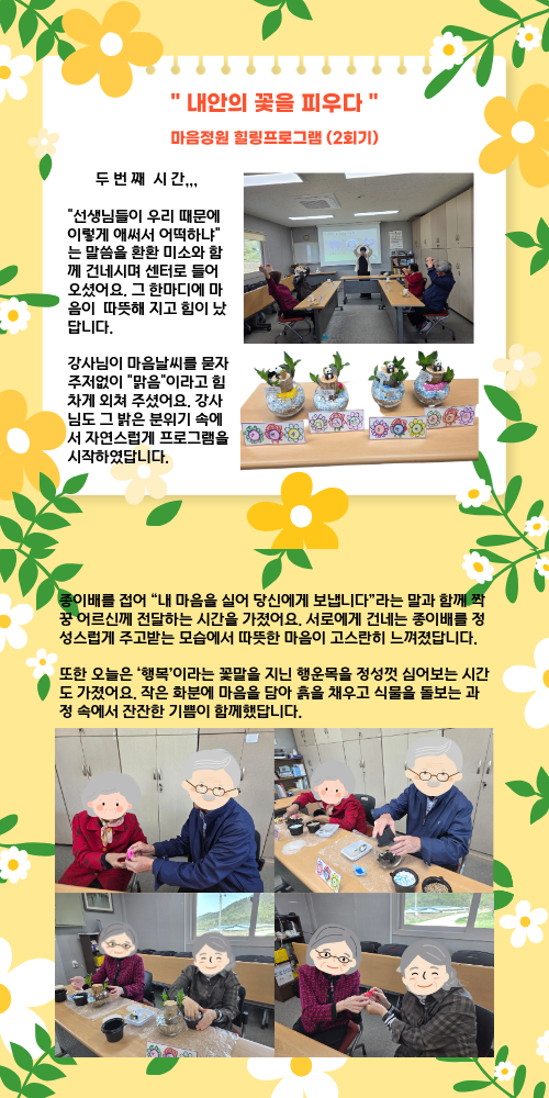 노인맞춤돌봄 "내 안의 꽃을 피우다" 마음정원 힐링프로그램(2회기) 페이지 정보 작성자 관리자 댓글 0건 조회 23회 작성일 26-04-16 18:34 목록 본문 ~ 다음글고령 개실마을 봄 나들이 26.04.13 댓글 0 댓글목록 등록된 댓글이 없습니다.