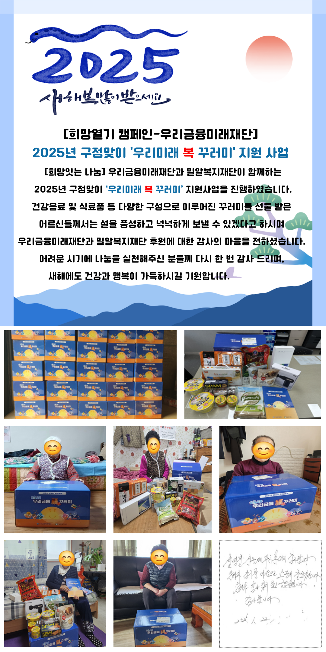 노인맞춤돌봄 2025년 구정맞이 '우리미래 복꾸러미' 지원사업 페이지 정보 작성자 관리자 댓글 0건 조회 890회 작성일 25-01-24 14:58 목록 본문 이전글2025년 2월 LG전자노동조합 구미지부 USR 나눔 전달식 25.02.14 다음글2025년 설레는 설나눔 25.01.22 댓글 0 댓글목록 등록된 댓글이 없습니다.