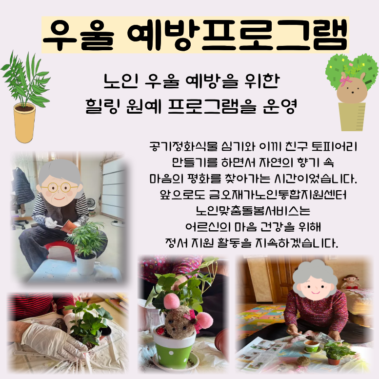 노인맞춤돌봄 우울예방프로그램 진행 페이지 정보 작성자 관리자 댓글 0건 조회 12회 작성일 25-11-07 14:22 목록 본문 다음글영양교육프로그램-백세시대 영양이 답이다.Ⅱ 25.10.13 댓글 0 댓글목록 등록된 댓글이 없습니다.