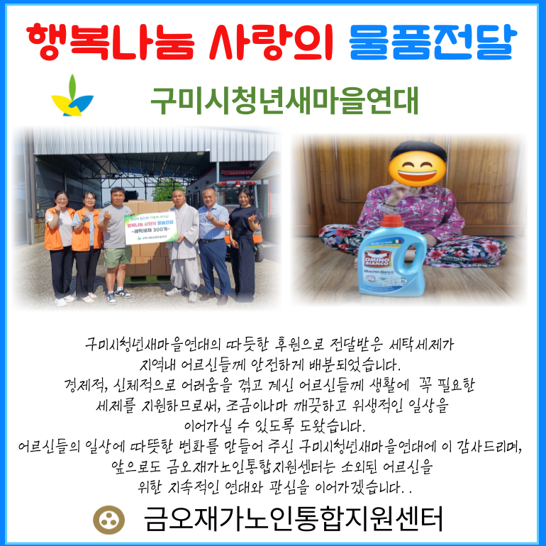 노인맞춤돌봄 구미시청년새마을연대 "행복나눔 사랑의 물품전달" 페이지 정보 작성자 관리자 댓글 0건 조회 546회 작성일 25-06-17 16:14 목록 게시판 리스트 옵션 검색 본문 이전글영양교육프로그램-백세시대 영양이 답이다. 25.07.01 다음글한화시스템과 함께하는 문경에코월드 나들이 25.05.14 댓글 0 댓글목록 등록된 댓글이 없습니다.