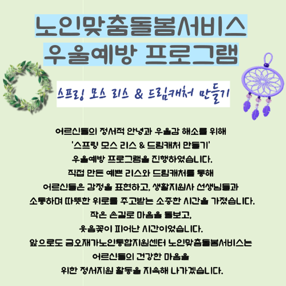 노인맞춤돌봄 우울예방프로그램-스프링모스리스 및 드림캐처 만들기 페이지 정보 작성자 관리자 댓글 0건 조회 421회 작성일 25-07-03 17:28 목록 게시판 리스트 옵션 검색 본문 이전글#여가활동#원예활동프로그램#마음을 가꾸는 초록정원 25.07.15 다음글영양교육프로그램-백세시대 영양이 답이다. 25.07.01 댓글 0 댓글목록 등록된 댓글이 없습니다.