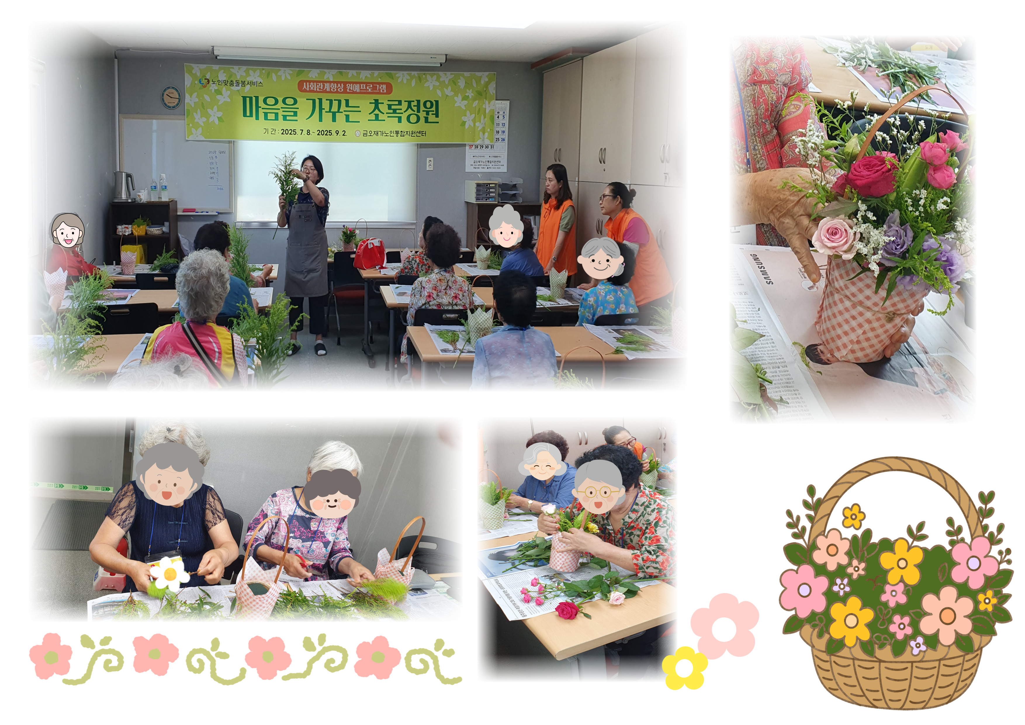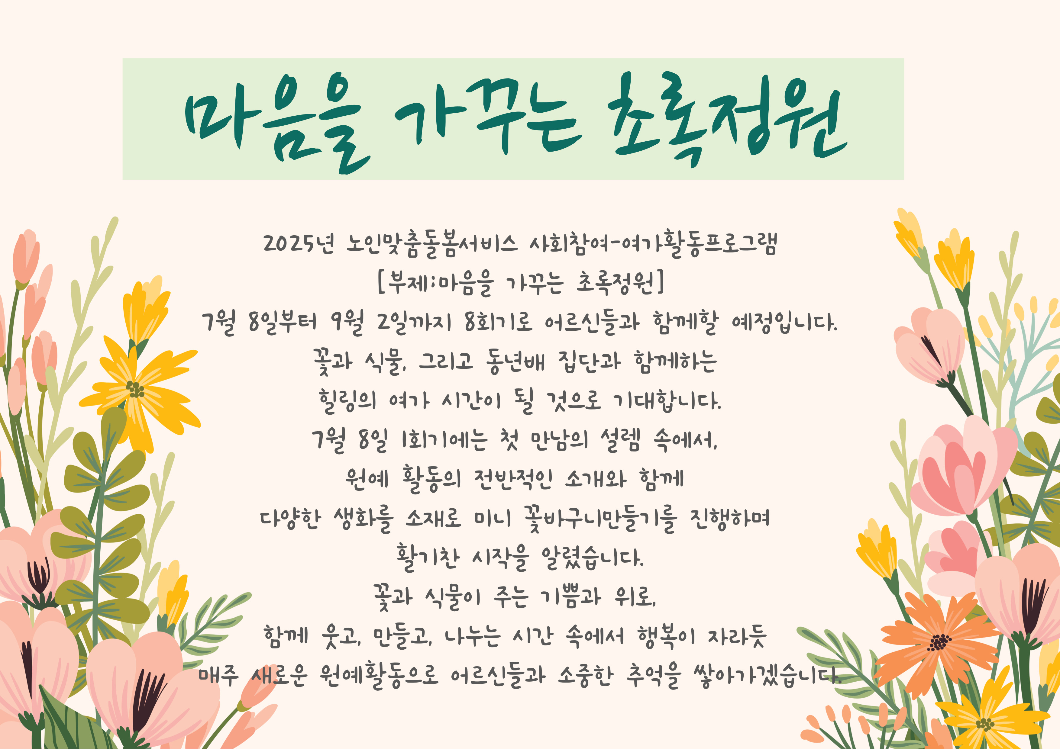 노인맞춤돌봄 #여가활동#원예활동프로그램#마음을 가꾸는 초록정원 페이지 정보 작성자 관리자 댓글 0건 조회 340회 작성일 25-07-15 18:22 목록 게시판 리스트 옵션 검색 본문 이전글2025년 보건교육프로그램 25.08.07 다음글우울예방프로그램-스프링모스리스 및 드림캐처 만들기 25.07.03 댓글 0 댓글목록 등록된 댓글이 없습니다.
