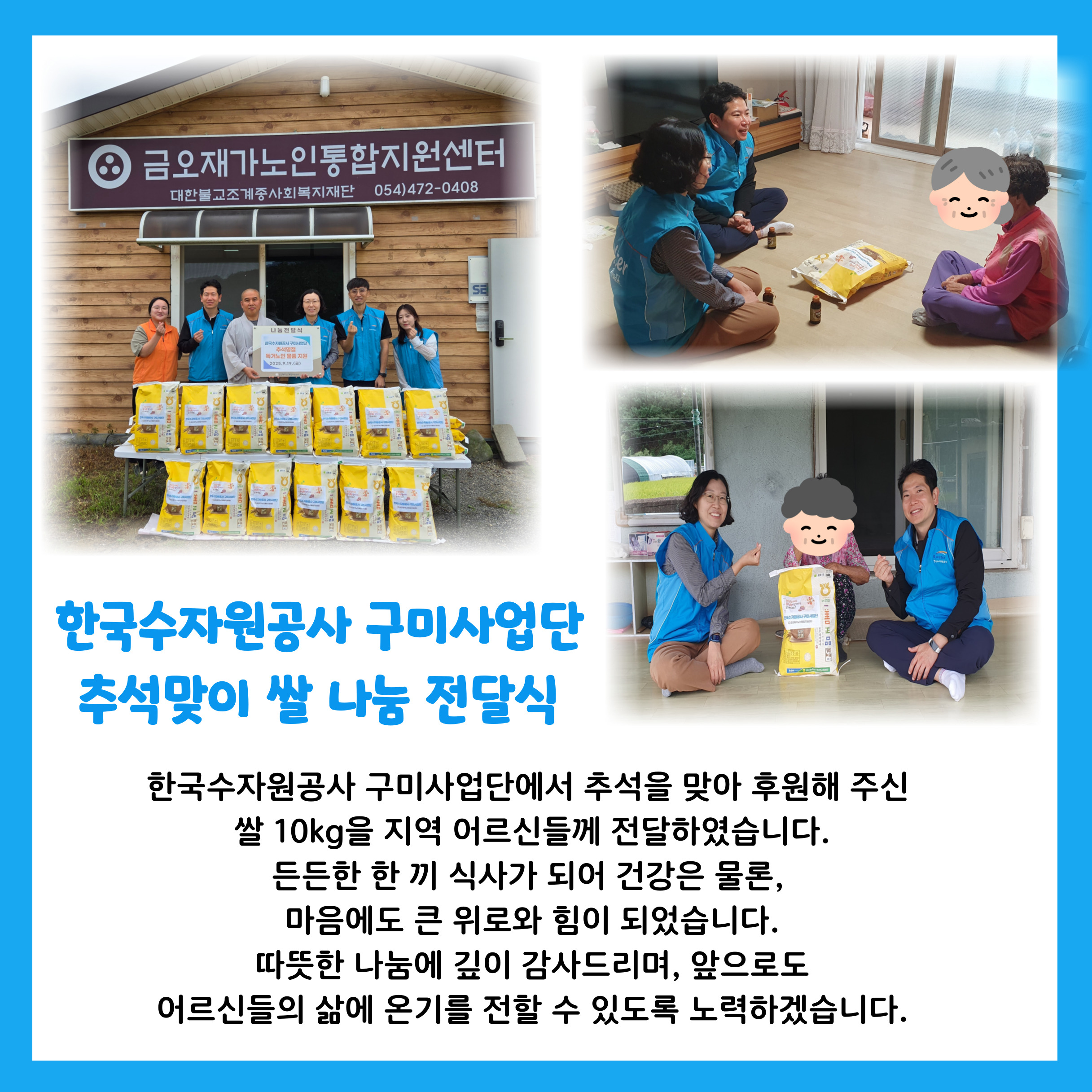 노인맞춤돌봄 한국수자원공사 추석맞이 쌀 나눔전달식 페이지 정보 작성자 관리자 댓글 0건 조회 163회 작성일 25-09-29 15:36 목록 본문 이전글신한라이프와 함께하는 사랑잇는전화 '행복나눔 키트 지원사업' 25.09.30 다음글#9월 20일 #구미사회복지사의날 '복지서비스전' 25.09.26 댓글 0 댓글목록 등록된 댓글이 없습니다.