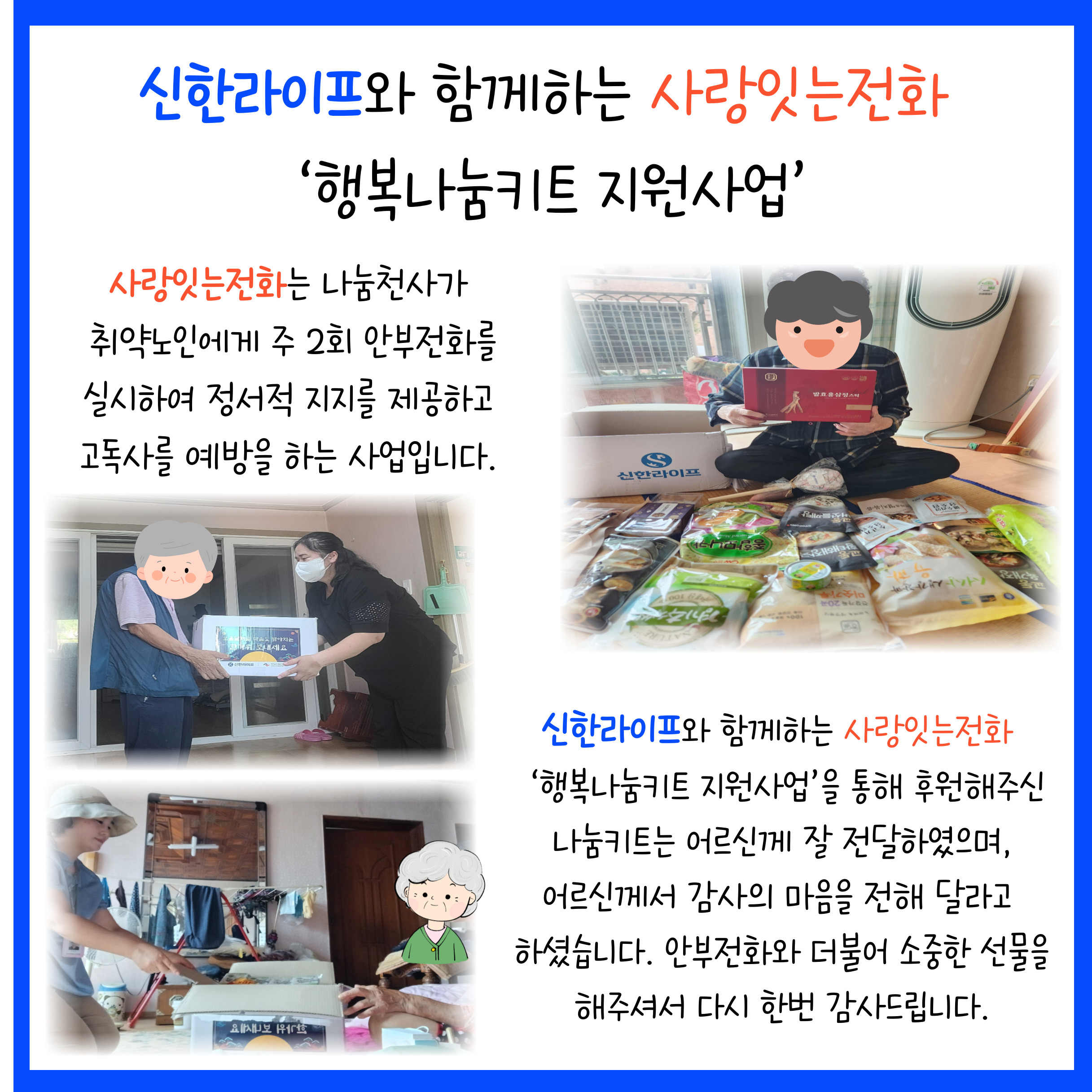 노인맞춤돌봄 신한라이프와 함께하는 사랑잇는전화 '행복나눔 키트 지원사업' 페이지 정보 작성자 관리자 댓글 0건 조회 156회 작성일 25-09-30 13:08 목록 본문 이전글2025년 추석 명절 나눔 #삼성 희망풍차 25.09.30 다음글한국수자원공사 추석맞이 쌀 나눔전달식 25.09.29 댓글 0 댓글목록 등록된 댓글이 없습니다.